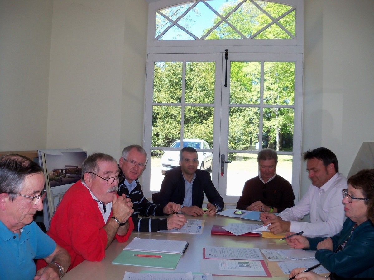 Entre échanges « techniques », « sociaux » et « politiques » les participants ont été informés des raisons de nos propositions (R. VINCENT) et sur l’option proposée avec les chercheurs de MONTPELLIER avec une entreprise réalisatrice prête à s’engager sur la construction d’une unité pilote (J.M. SEGUREL) sur le site classé SEVESO de la poudrerie de BERGERAC. Photo:De droite à gauche : Mme ALLAIN, Mr CATHUS, Mr PLAZZI, Mr BENFEDOUL, Mr RAZAT, J.M. SEGUREL et R. VINCENT